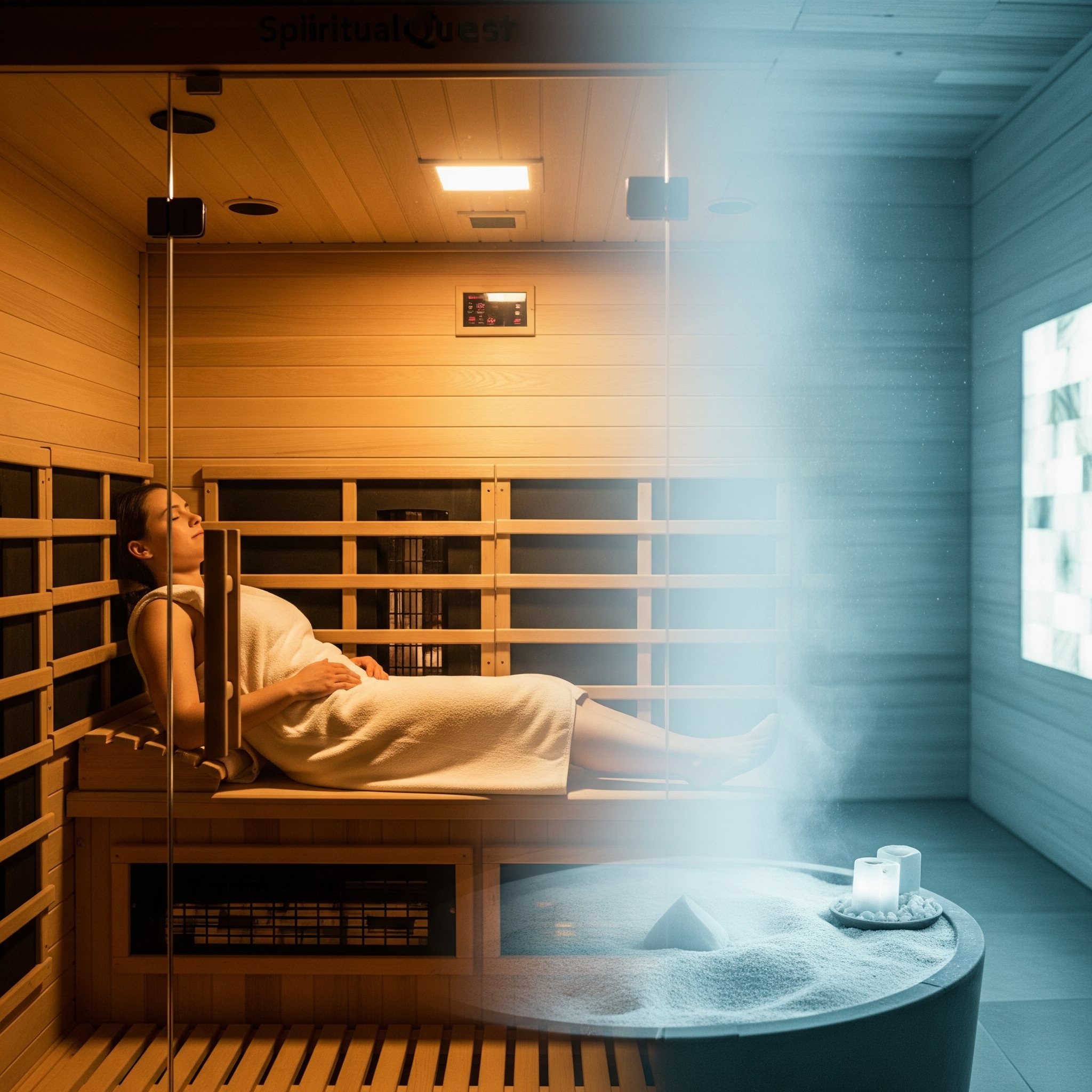 A visually rich image showcasing the integration of infrared sauna and dry salt therapy. A warm, inviting sauna interior seamlessly blends with a cool-toned salt therapy environment, highlighting the holistic benefits of SpiritualQuest’s Salt Room Cabins.