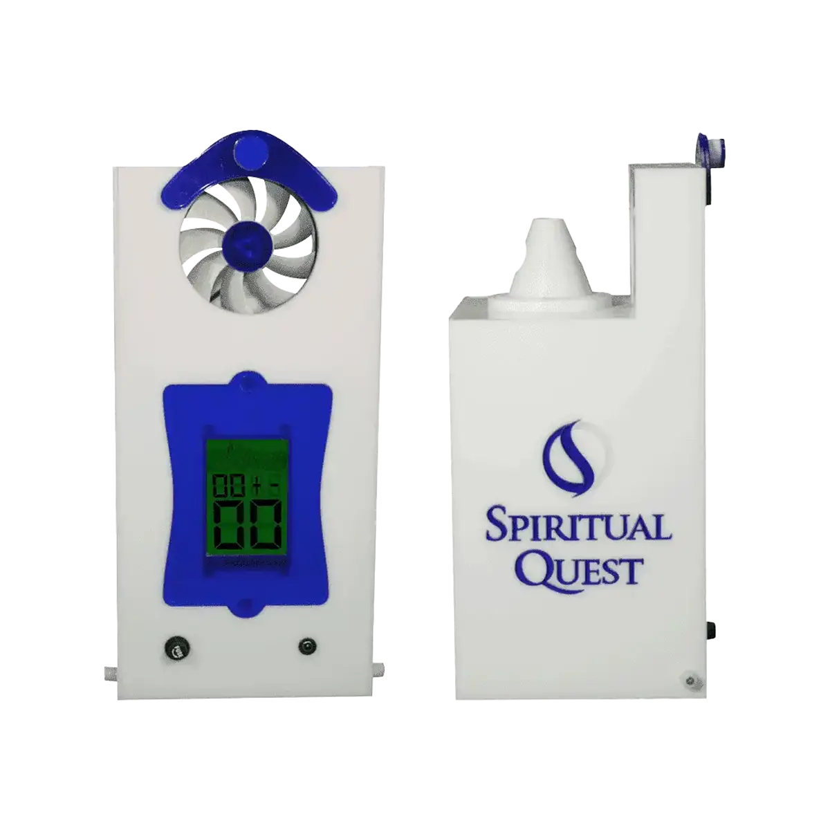 SpiritualQuests Power Portable Halo Generator, as the name suggests, is portable (weight: 15 pounds), meaning you can move it between locations depending on your needs, making it a dual use portable salt therapy unit. It requires a standard 110 Volt electric outlet. Its control panel allows you a choice of three common pre-set mist flows, or you can override them and manually input your settings on this compact programmable halogenerator. It provides a salt mist flow enough to cover 150 square feet, ideal for personal and smaller commercial spaces. This portable salt mist generator is a professional-grade unit, the same we use in all of our salt systems.
