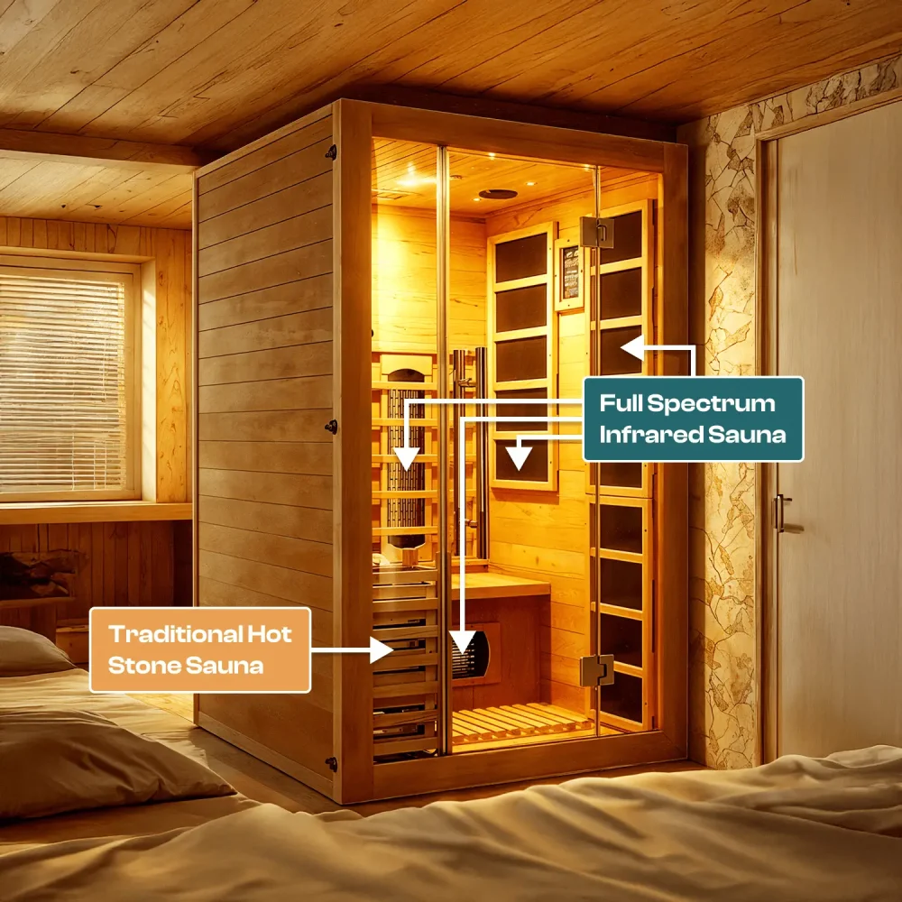 The Maverick combines full spectrum infrared technology with a traditional hot stone sauna in one unit. This dual-function design offers both deep cellular detox and intense sweat therapy—making it a complete wellness solution.
