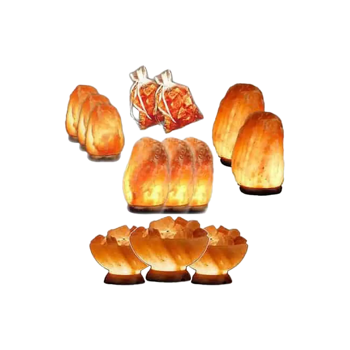 Our Abundance and Wellness Salt Lamp Value Pack consists of 3 medium Himalayan salt lamps, 3 large salt lamps, 2 extra-large salt lamps, 3 abundance bowls, and 2 Himalayan bath salt tea bags. All lamps come with UL-listed bulbs and cords.