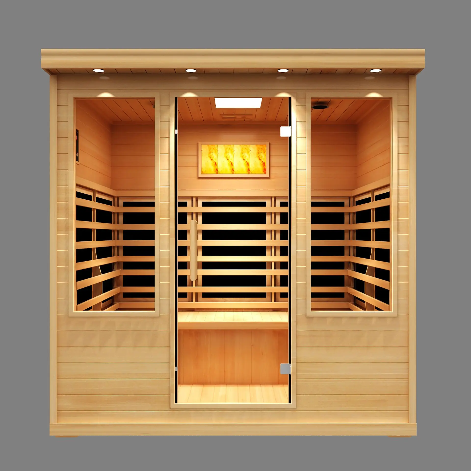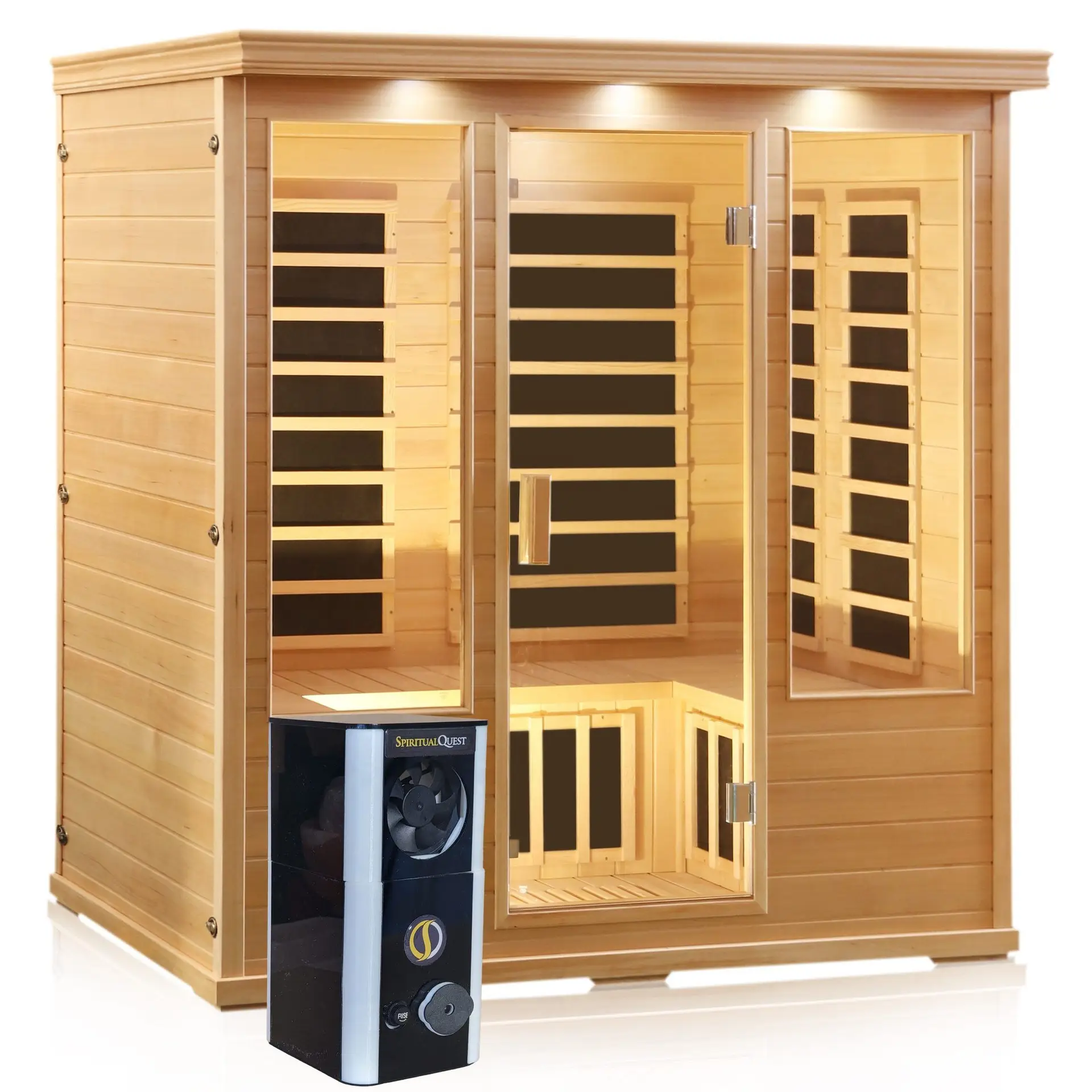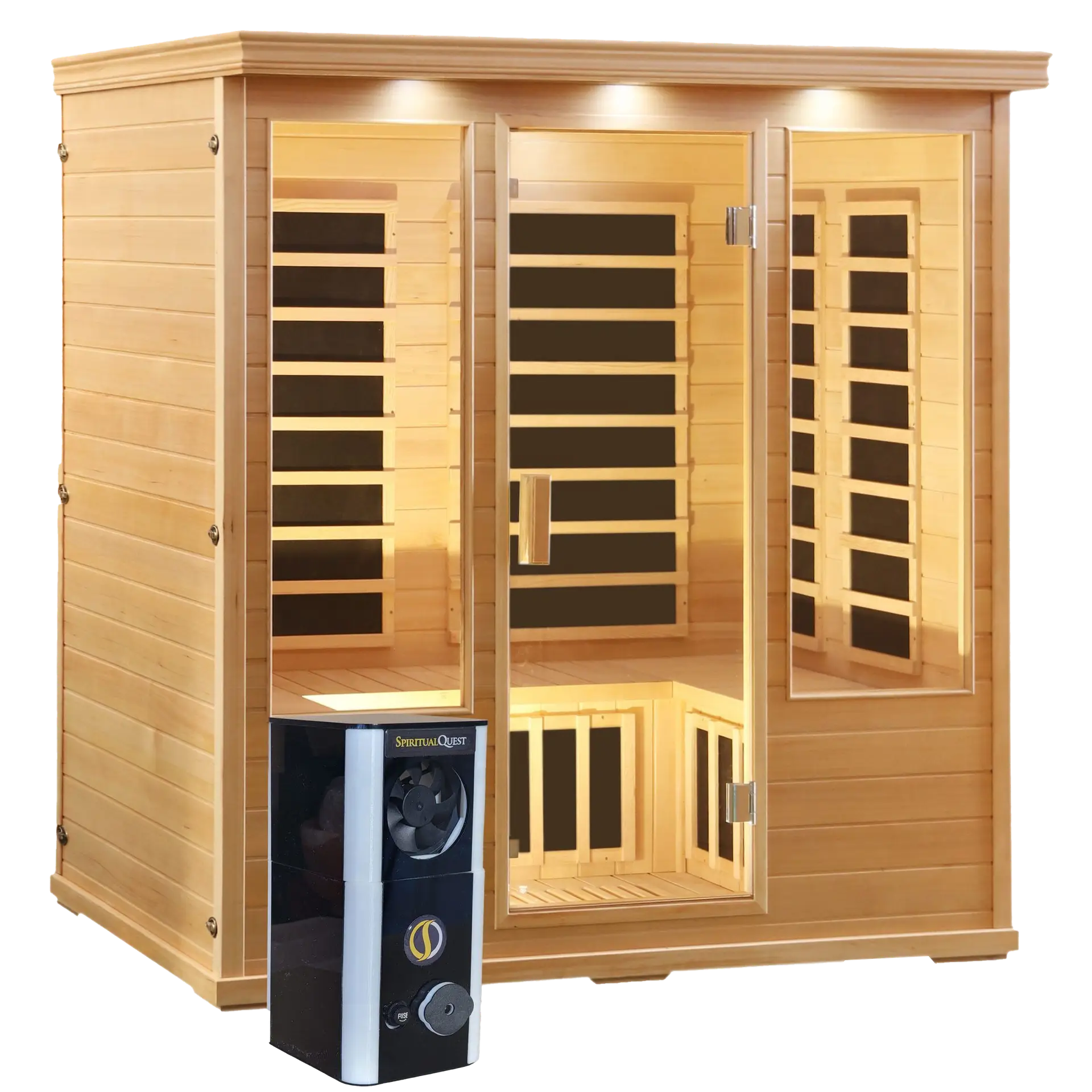The cabinet, made of Canadian white cedar, comfortably seats four in this quad infrared salt cabin. It includes a full-spectrum, carbon fiber infrared sauna, making it a large salt therapy cabin with infrared. Essentially, you get three healing systems in one unit: a fully functional sauna, a professional-grade Halo Therapy salt room (halogenerator for four person salt room), and an LED chromotherapy (light therapy) chamber. The system offers many modalities for yourself or your customers in this large group salt mist therapy. Natural salt therapy is a miracle for those suffering from COPD, Asthma, and other damaging lung ailments in this four-person dry salt inhalation cabin. Breathe easy, and donтАЩt resist the need for the relief you seek in this commercial salt therapy cabin. The Halo generator is warranted for three years from the factory, and the benefits will last a lifetime in this multi-person Halo cabin system.