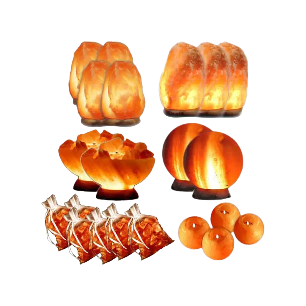 Save $100 from their individual prices by buying this massive 21 piece salt lamp value pack. Included are 4 of our most popular lamps, the тАЬQuasarтАЭ medium salt lamp, 3 large salt lamps, 2 abundance bowl lamps, 2 spheres (globe) salt lamps, 6 Himalayan bath salt tea bags, and 4 Himalayan salt tea light candle holders. Each lamp is individually packaged and comes complete with UL listed cord and bulb.